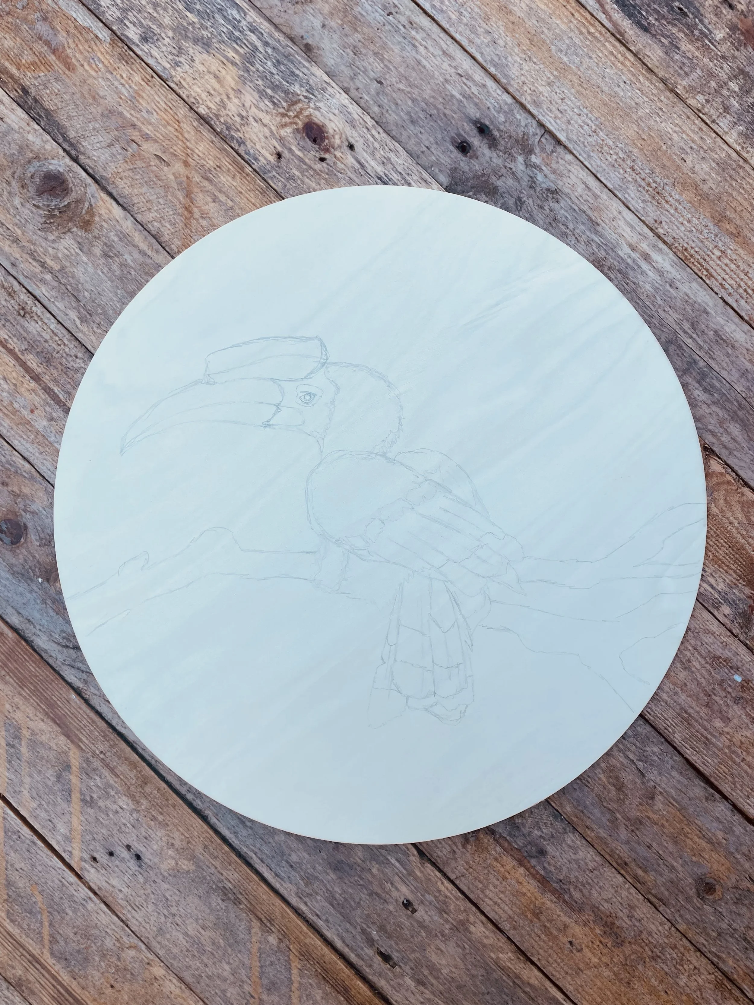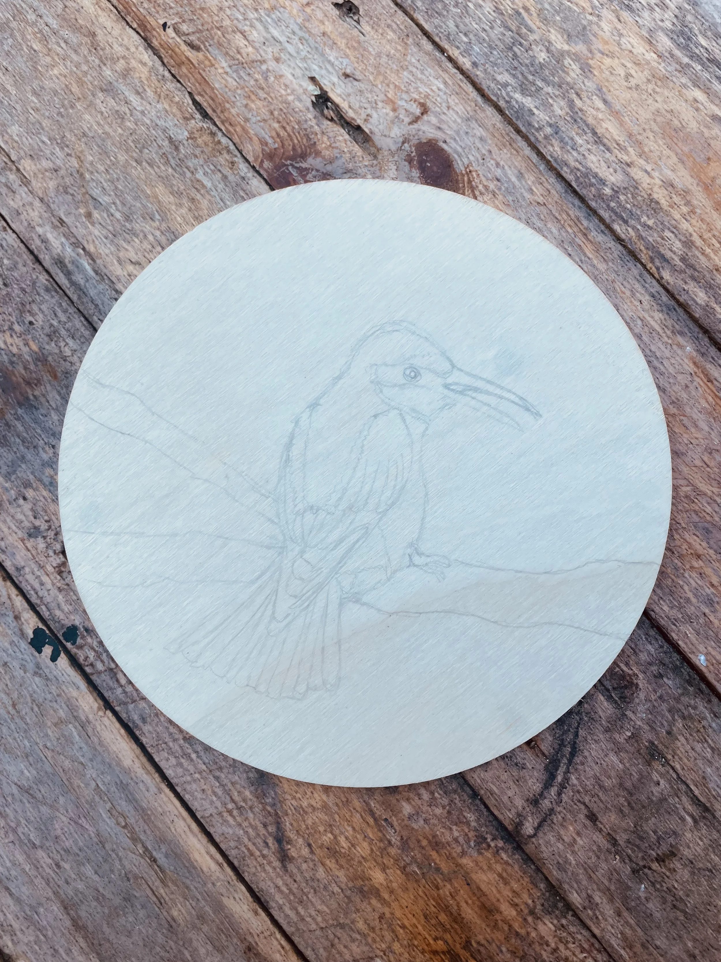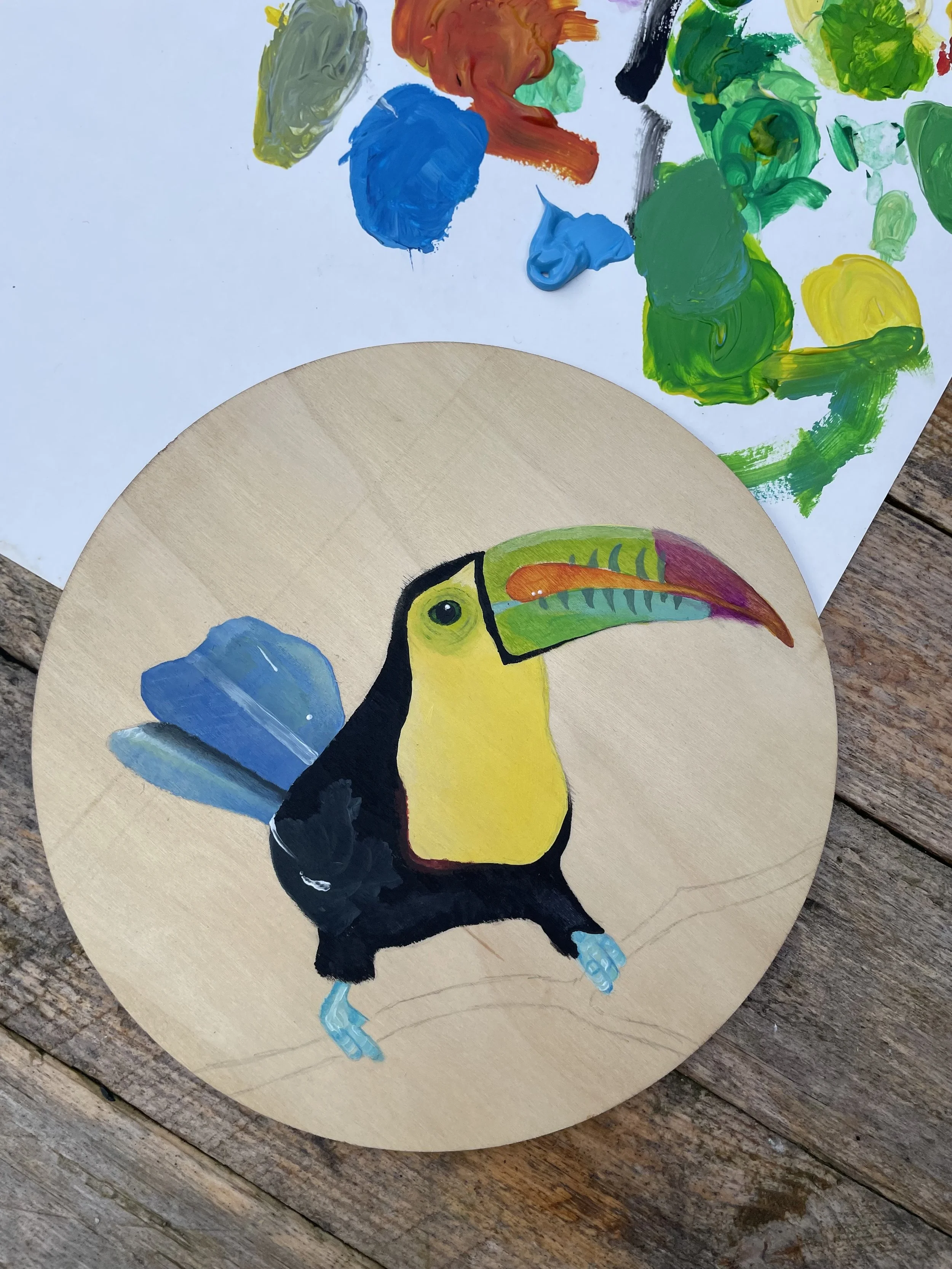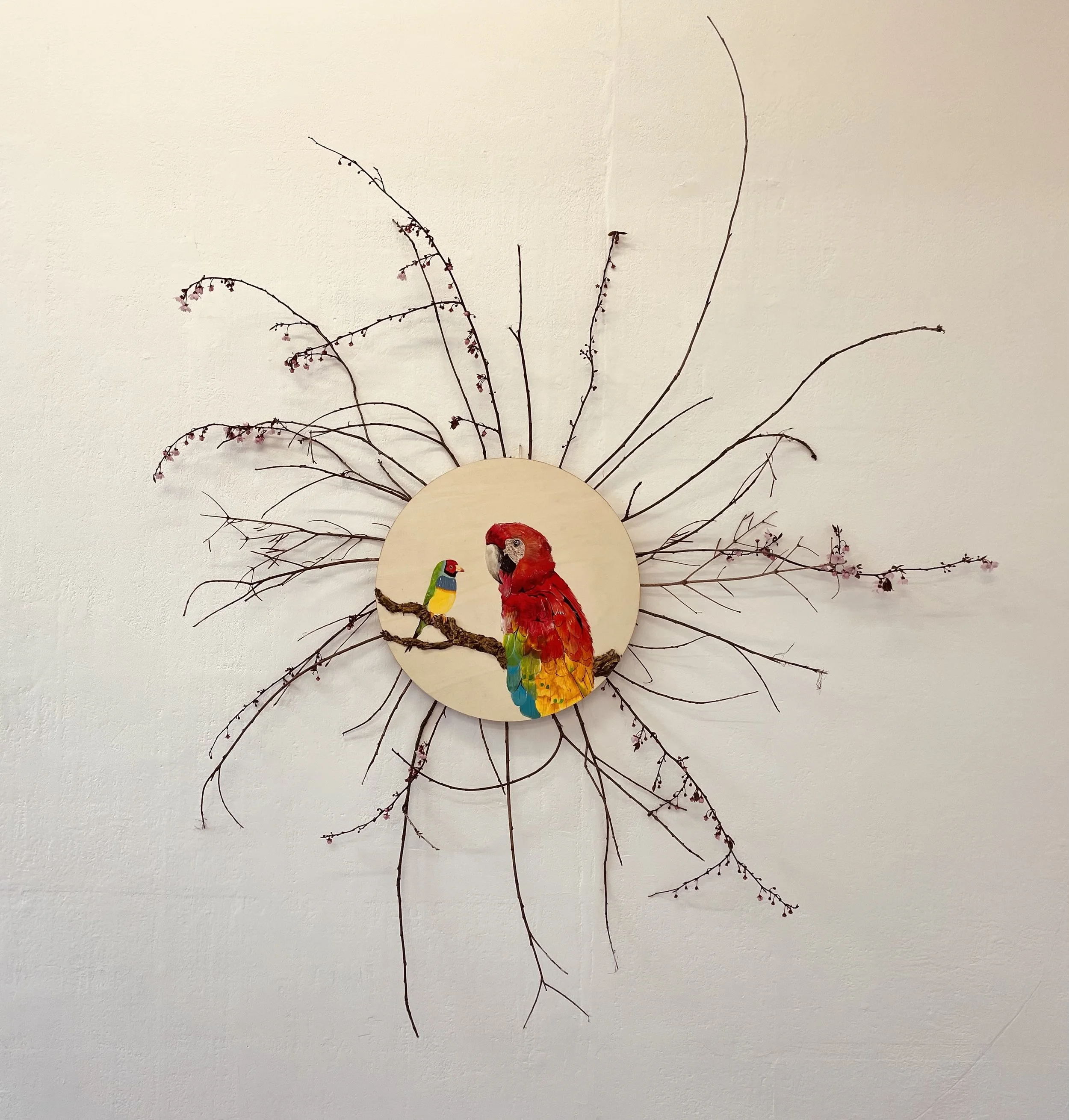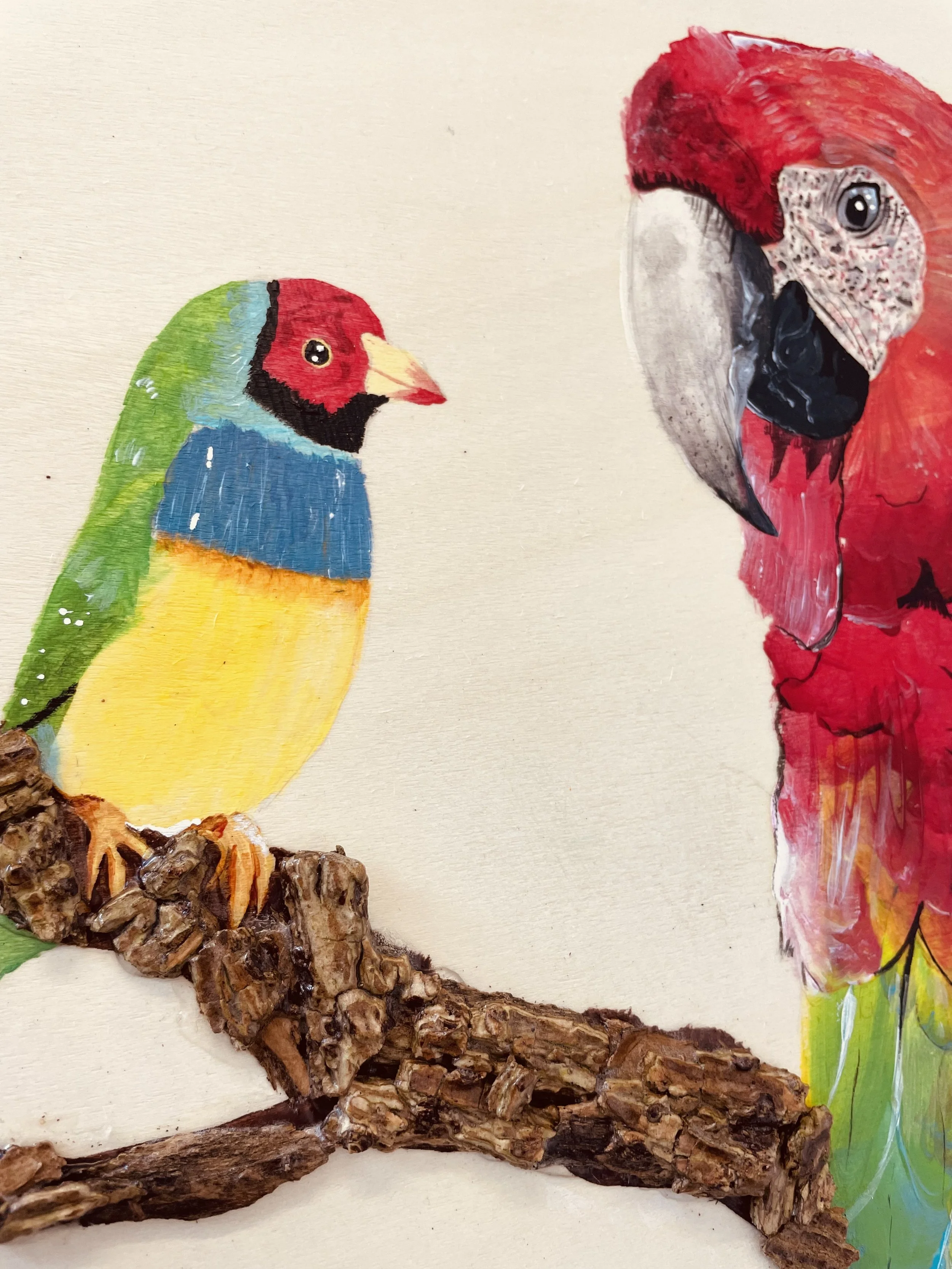 2 out of 3 of the wooden disks were varnished so there was a variation. of tone in the wood but I didn’t want to take away from its natural elements. As well as this is added real bark onto the toucan piece and find its tactile quality to be an asset to the work.