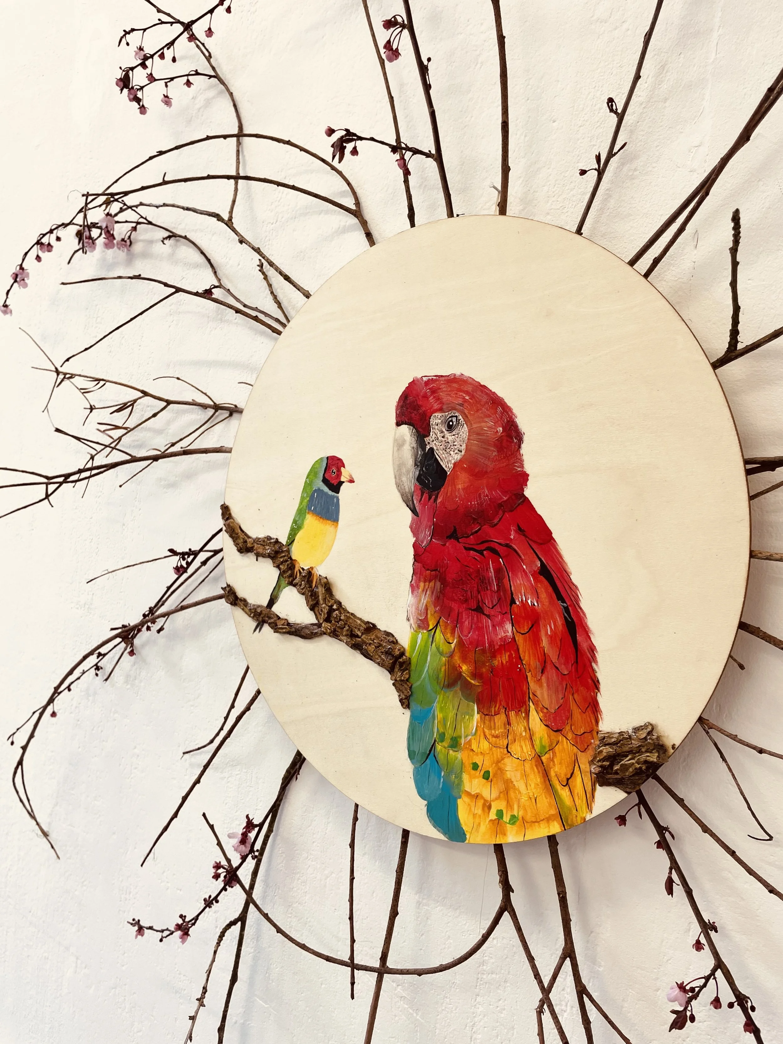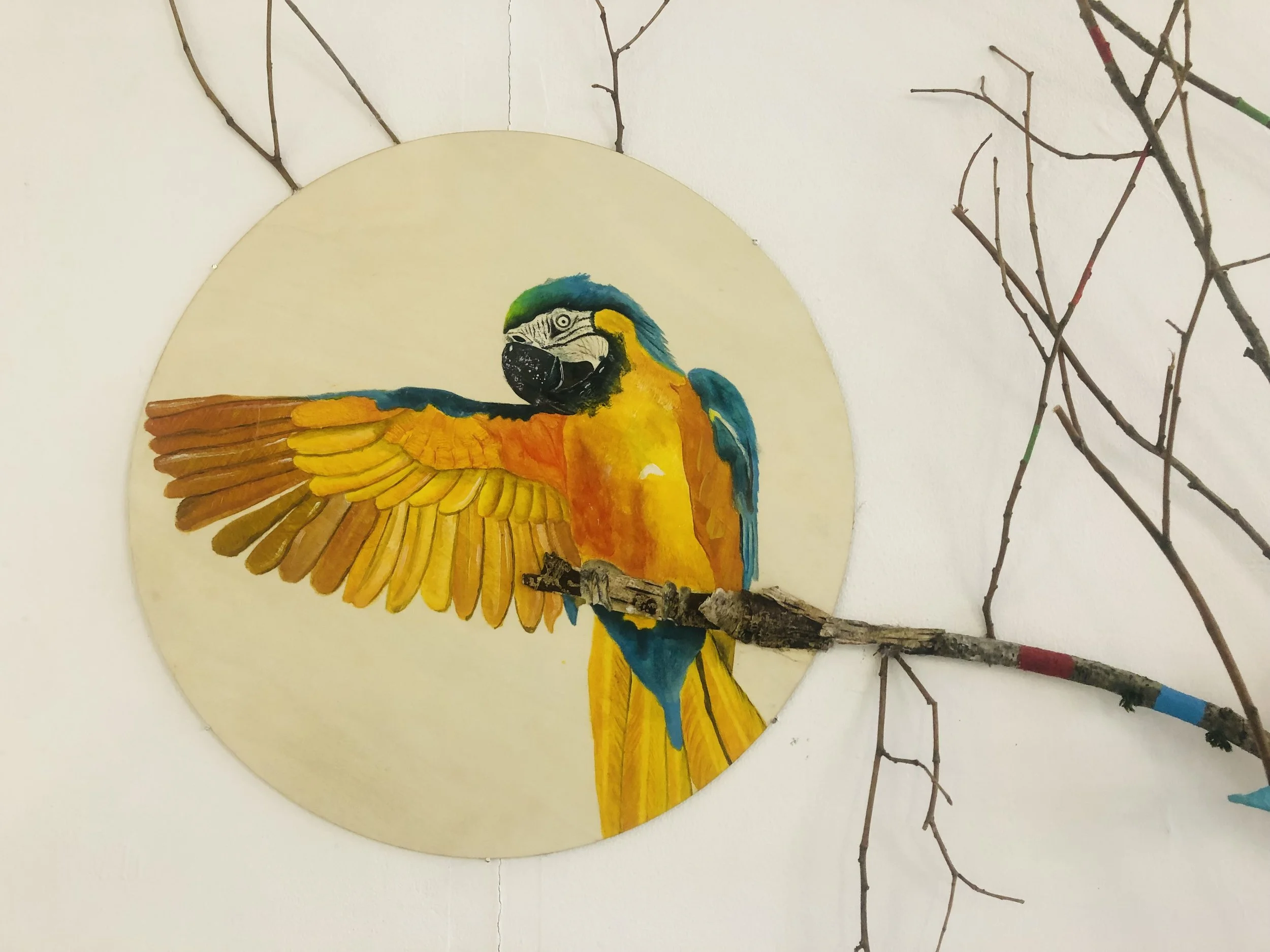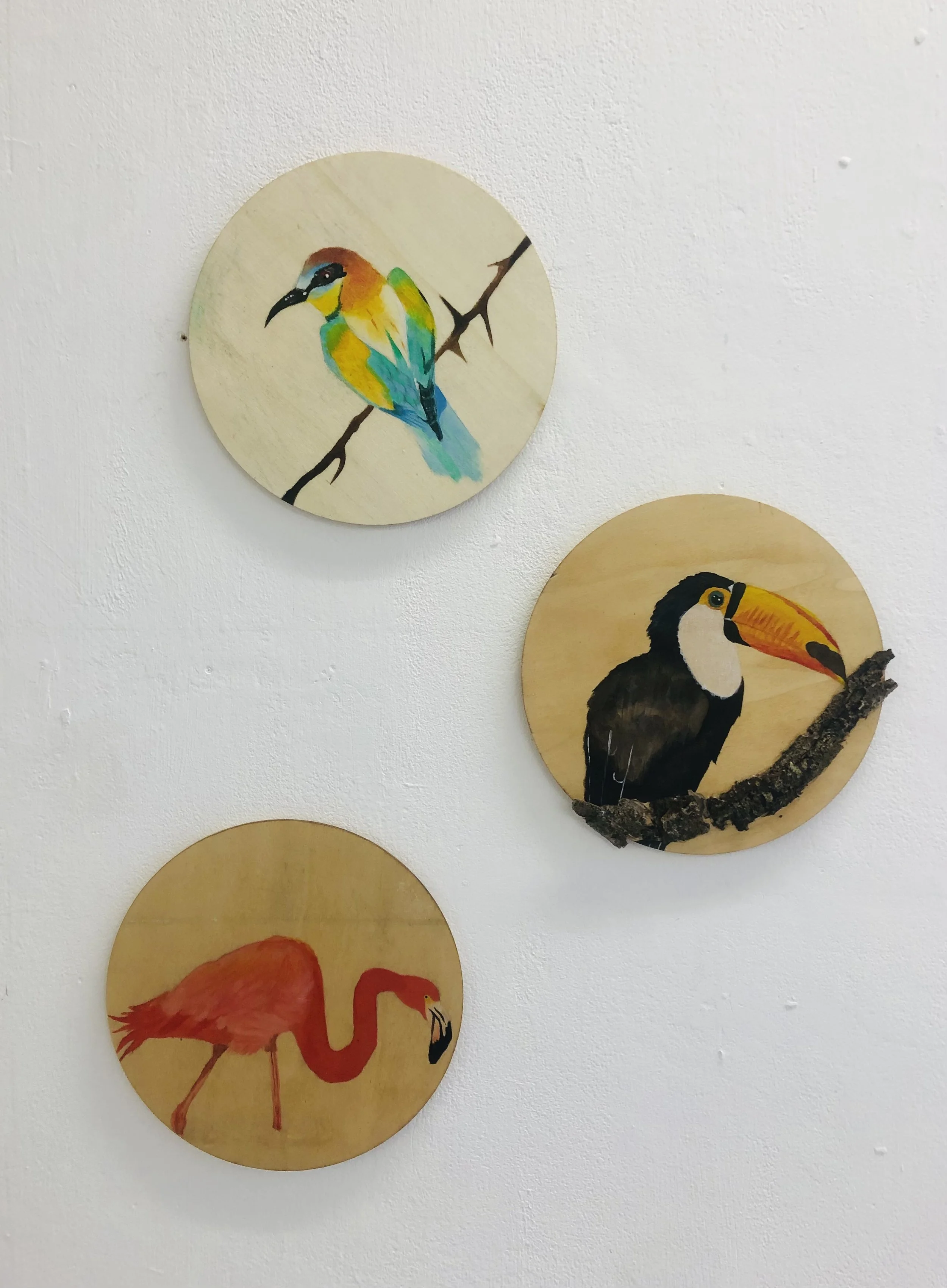 Exhibition 1 - For my first exhibition I created 3 painted illustrations of tropical birds I have formed a fascination and love for over time. As mentioned, I wanted to explore the creating of tropical birds onto British wooden rounds and form a link between these two different environments in which birds live and how versatile and independent their aesthetic is depending on their surroundings. Always fascinated with colour I thought it would be fun to experiment with the painting the colourful birds I am fascinated with, on a surface created from where they dwell. Below I have included images of my completed first exhibition for you to view and reference.