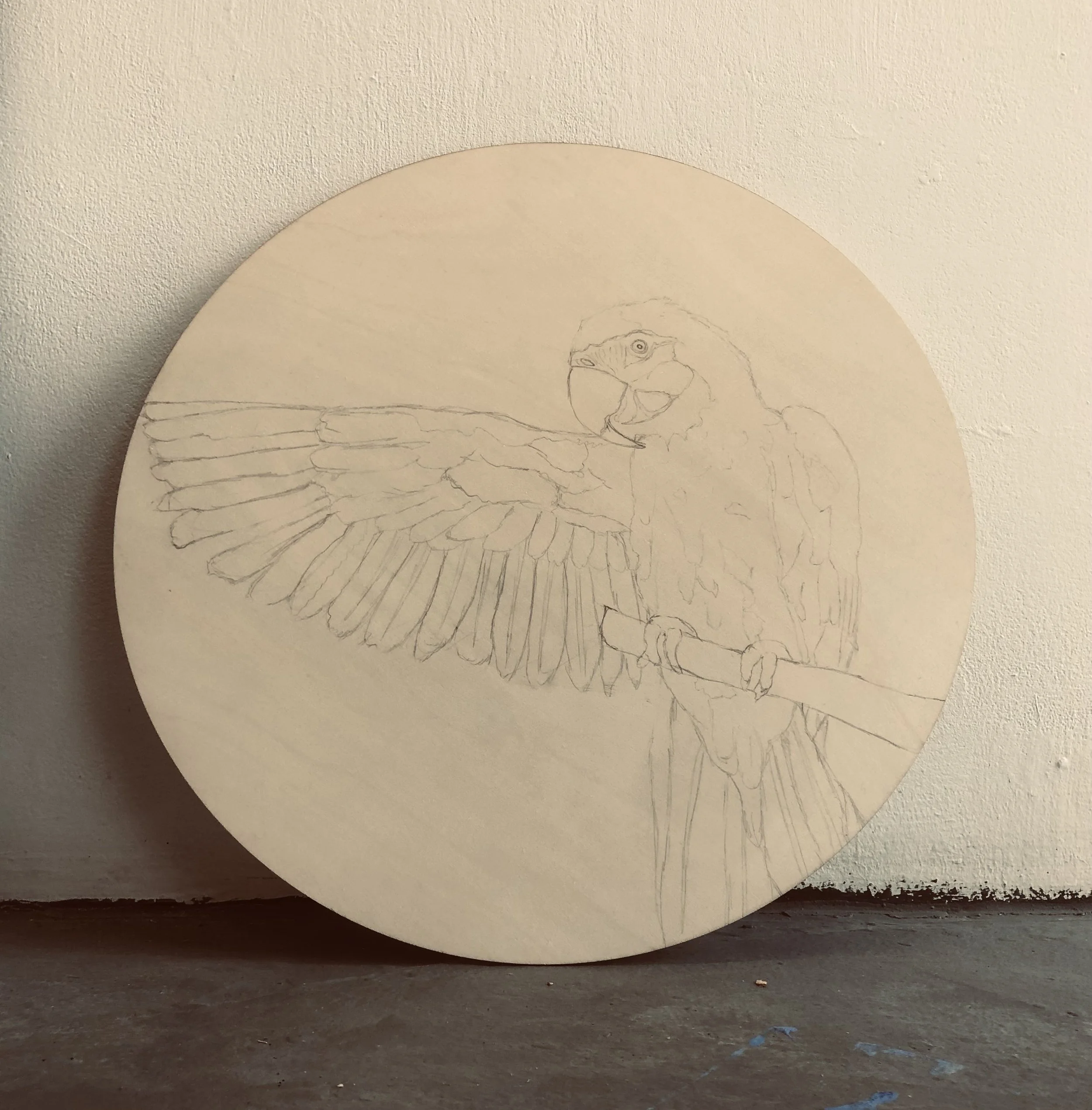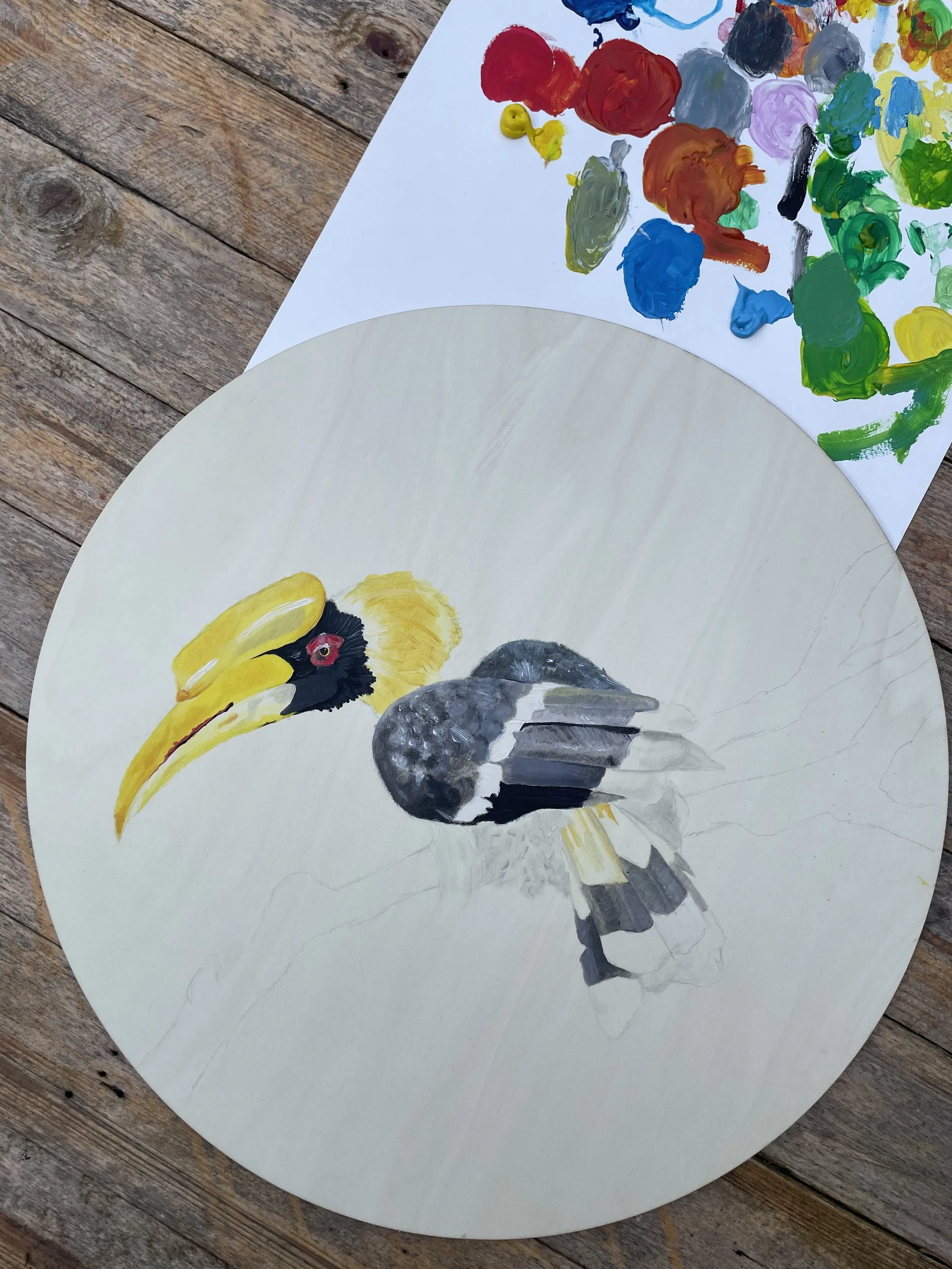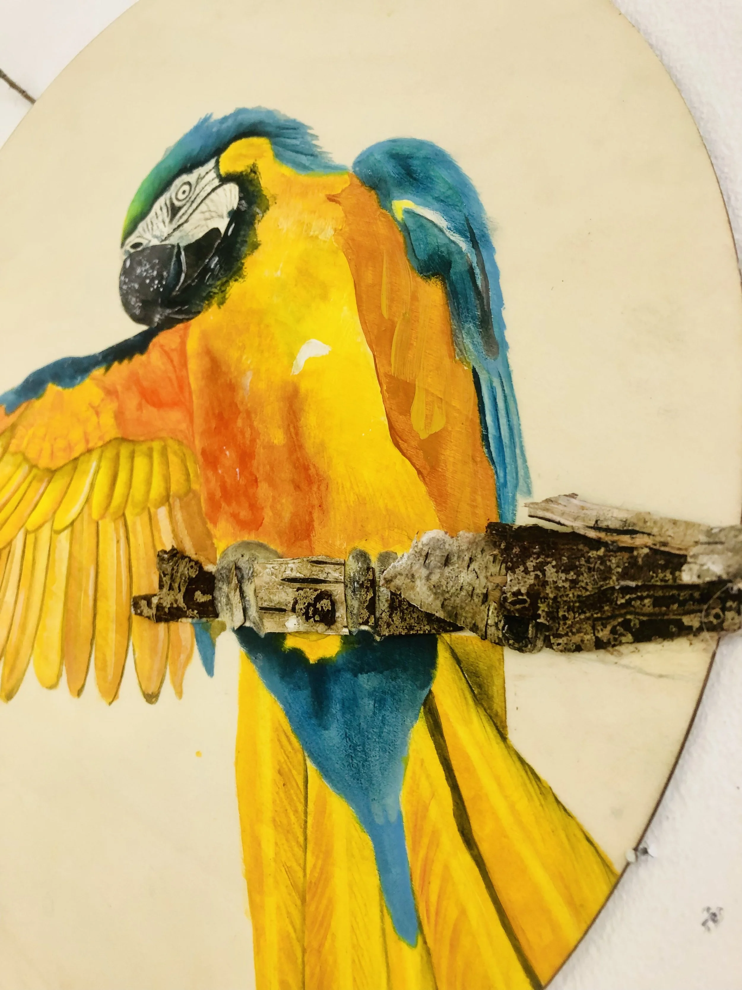 Exhibition 1 - For my first exhibition I created 3 painted illustrations of tropical birds I have formed a fascination and love for over time. As mentioned, I wanted to explore the creating of tropical birds onto British wooden rounds and form a link between these two different environments in which birds live and how versatile and independent their aesthetic is depending on their surroundings. Always fascinated with colour I thought it would be fun to experiment with the painting the colourful birds I am fascinated with, on a surface created from where they dwell. Below I have included images of my completed first exhibition for you to view and reference.