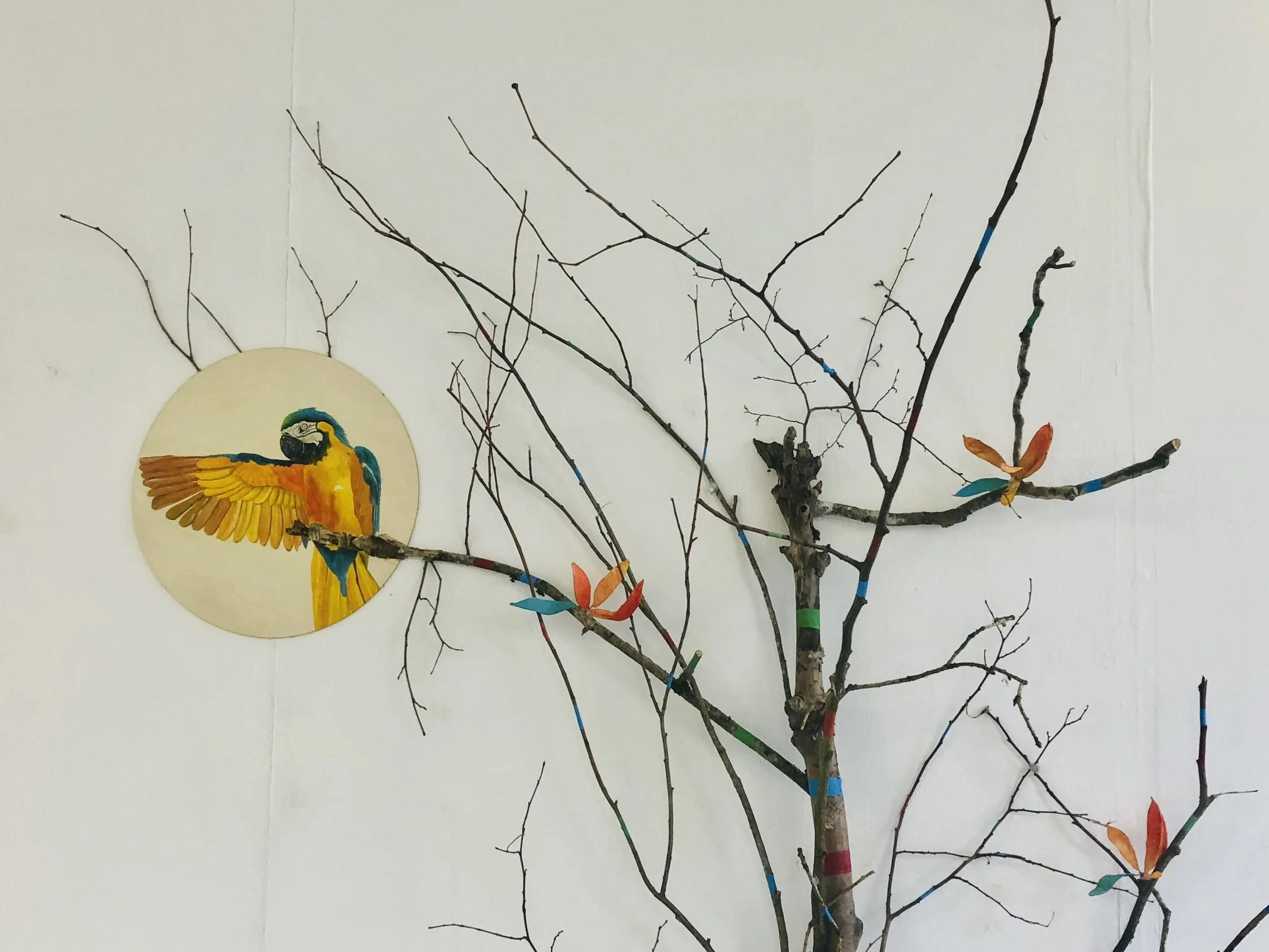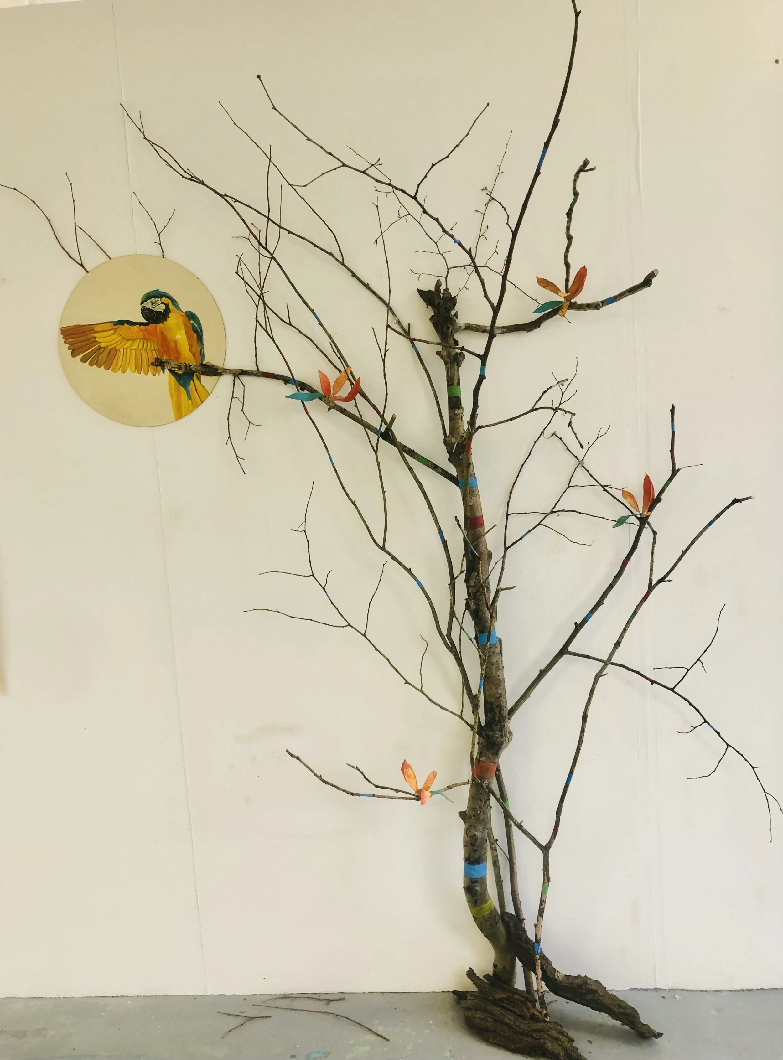 Exhibition 2 - after experimenting in the woods with my first exhibition (see experimentation above) I realised the importance and significance of featuring some branches and more bark oil my work to evoke the British landscape further into my tropical depictions of the birds I love. I also realised i wanted to include birds of paradise; thew flowers; into my work as they, as the name connotes, have the colour and aesthetic of the tropical birds and allow colour to travel further across my work. For this exhibition, I decided I wanted to create a tree and bring the outside in at our exhibiting show. I love the ideas of creating something new out of already so individual and stand-alone so I foraged for fallen branches from different trees in different areas of woodland to bring together to become a ‘new tree’. Upon that tree I wanted to bestow a tropical bird on my wooden rounds while showering it in colour to really pull the rainforests colour palleted onto British shrubbery. This is where my coloured bands also came into play (spoken about in ‘experimentation’ section of the menu above)