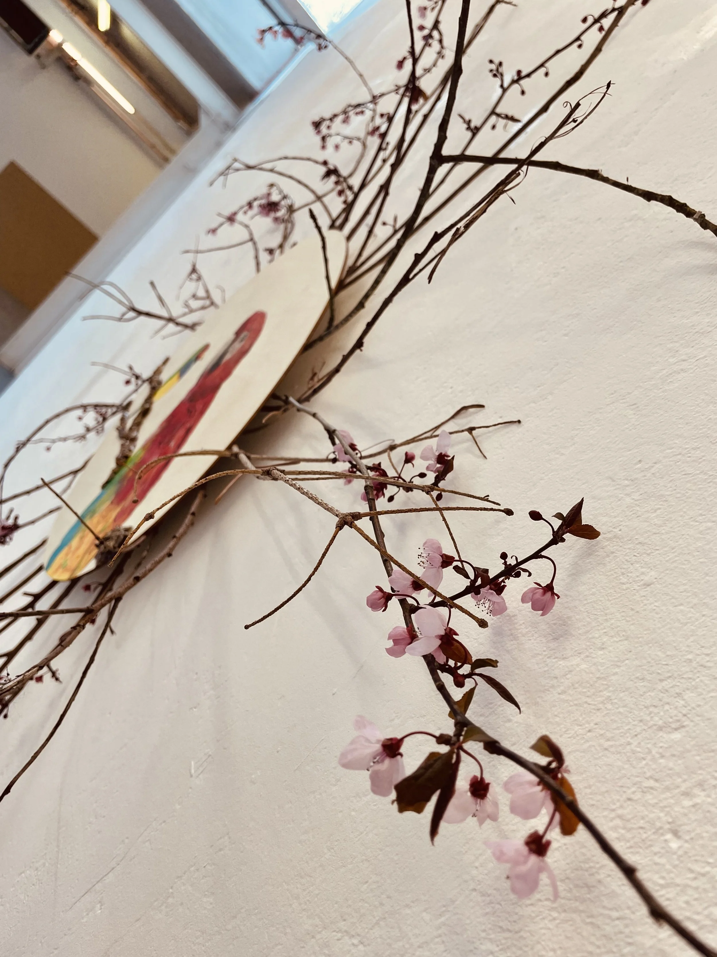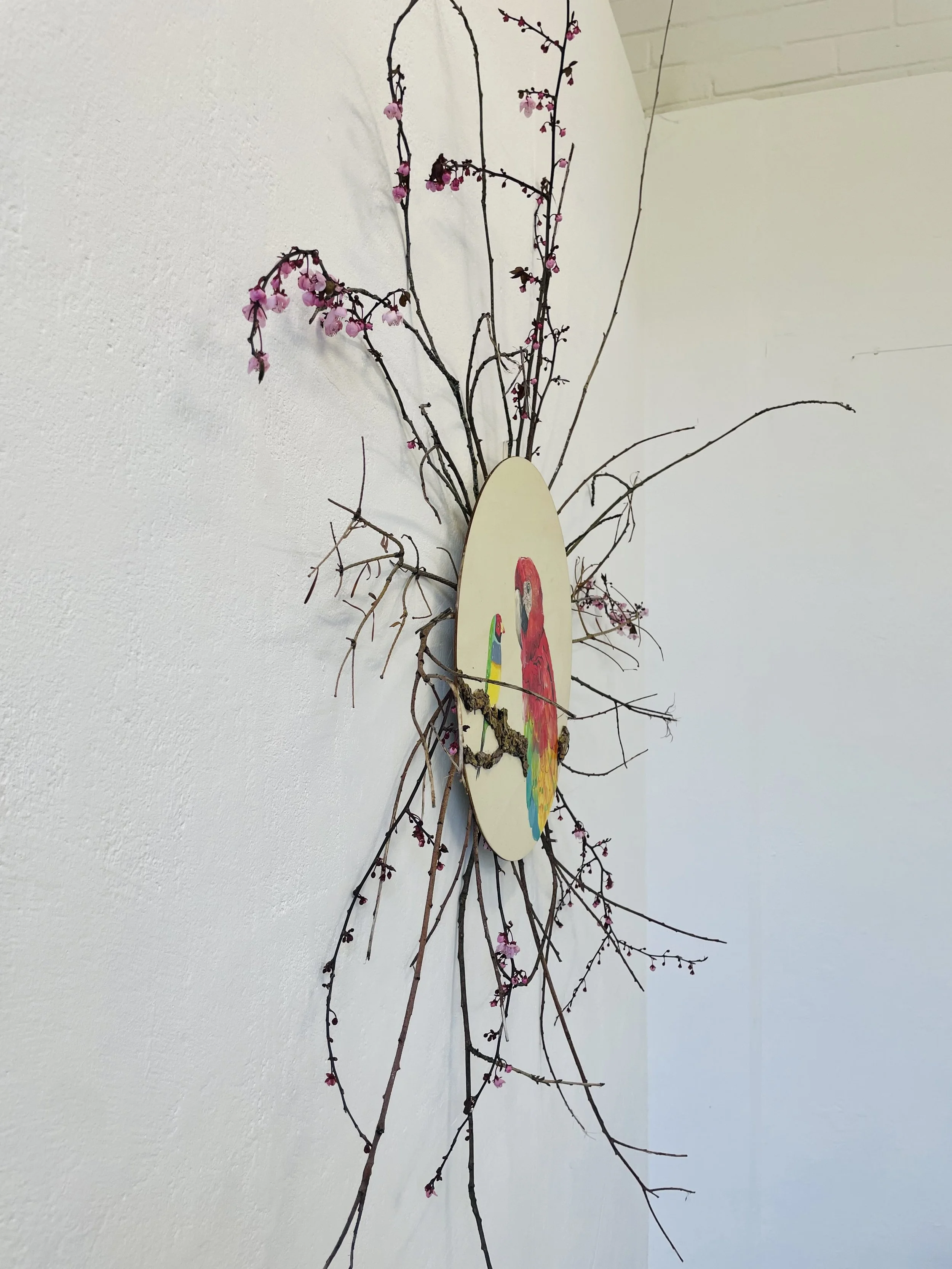 I found this very interesting and decided I would created my own ‘fan of interest’ for my art piece in exhibition using floral branches from the apple blossom tree in my garden. I used these pieces to surround my wooden round fanning out from all the sides giving a sense of scale to my work much like birds try to do as well as bringing in interest and attention to the painted piece at the centre of the artwork.