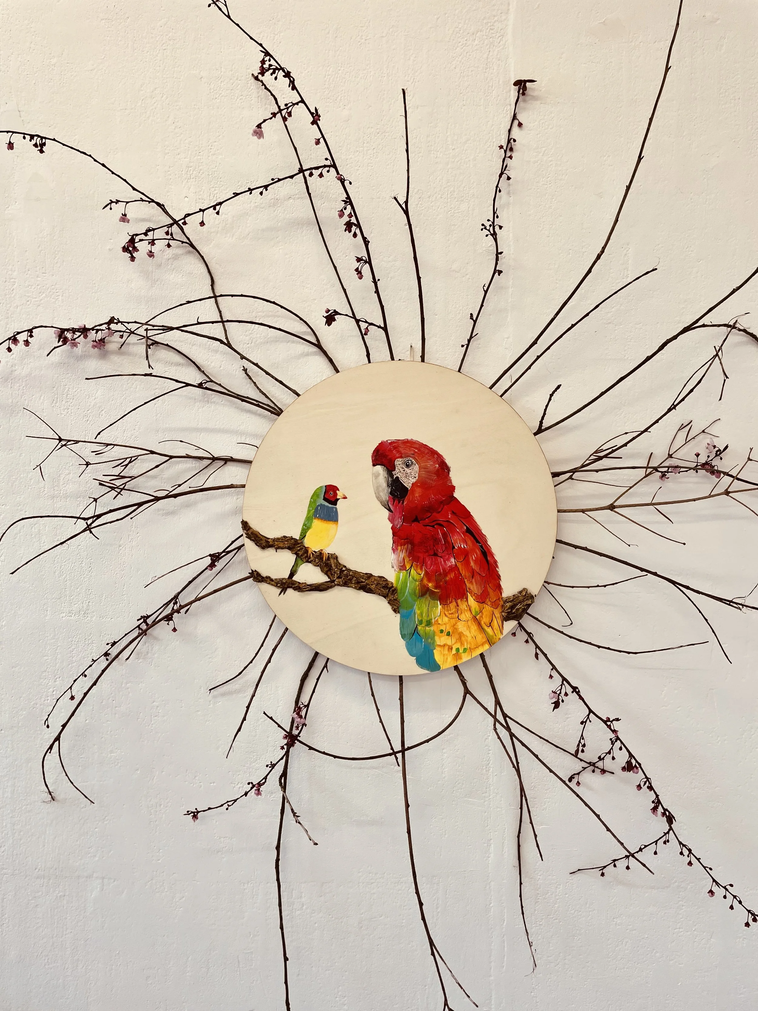 From here I intend to create my final exhibition piece on a larger scale with more rounds featuring the beautiful tropical birds, much like exhibition 1, but incorporating all I have learnt from from my first 3 exhibitions. I intend to create multiple rounds of different sizes, some sporting the ‘fan’ of interest (spoken about in experimentation - research prep) to bring interest and focus to the work. I will also be exhibiting my exhibition project in the woods next to the studios on campus to allow for the fully immersive viewing experienceI intended from my art pieces. I would like for the exhibition to almost be a trial walking through the britch woodland but experiencing what it would be like to have such wonderful tropical birds in the UK.